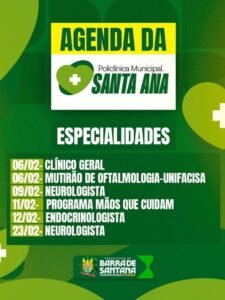 A Prefeitura de Barra de Santana, por meio da Secretaria Municipal de SaĂșde, divulga a agenda de especialidades mĂ©dicas disponĂveis no mĂȘs de fevereiro na PoliclĂnica Municipal Santa Ana: