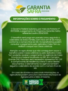 O Governo Federal autorizou, por meio da Portaria nº 357/2026, o pagamento do Programa Garantia-Safra referente à safra 2024/2025.