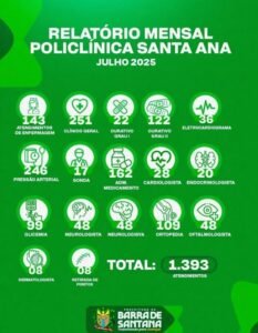 A saúde da nossa gente é nossa maior prioridade! No mês de julho, a Policlínica Santa Ana totalizou 1.393 atendimentos, com muita dedicação e carinho, garantindo o bem-estar da nossa população, realizando um serviço humanizado e de qualidade.